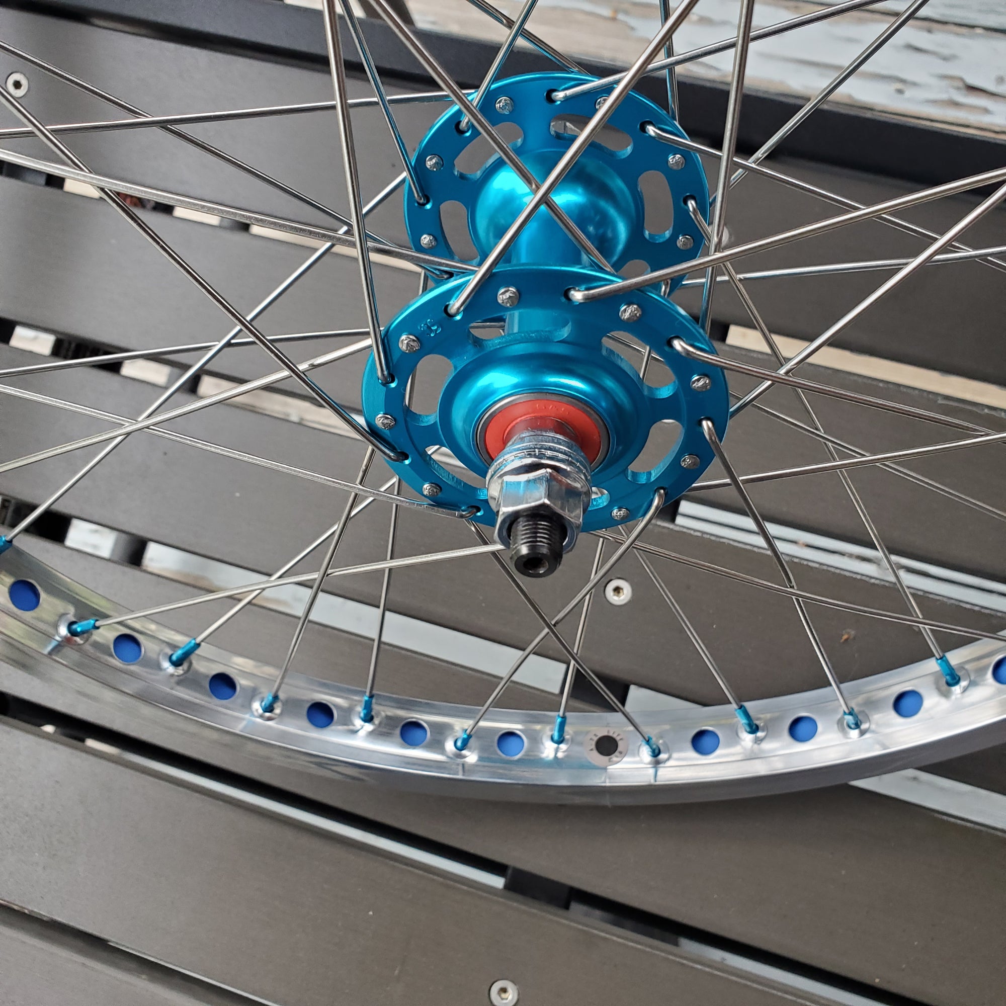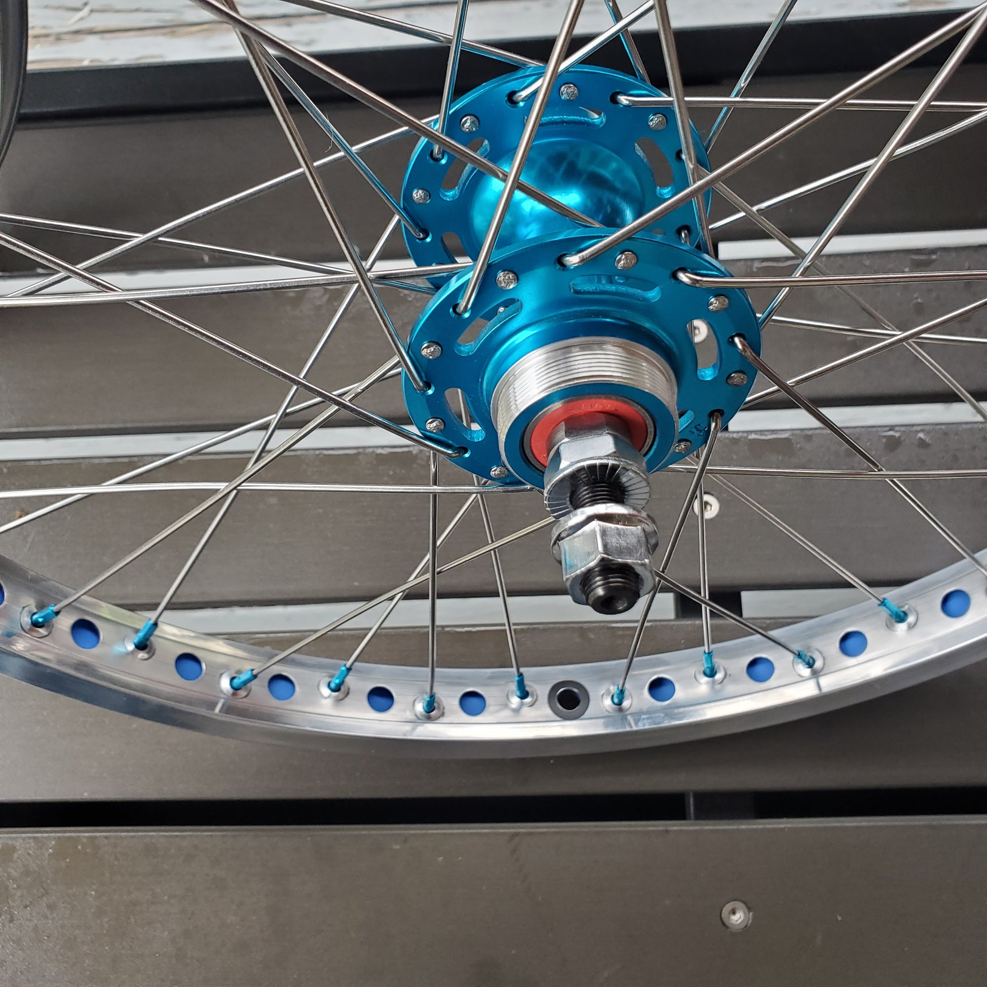 The 36 spokes are stainless steel w/ 5/8" Blue anodized aluminum nipples, and they are built 3X. These wheels will accept 20 x 1.75 - 2.40 tires (406mm).