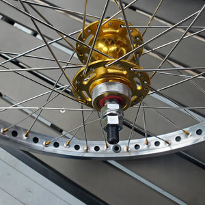 The hubs are gold anodized alloy large flange w/ cut-outs and sealed bearing with 3/8 axles front & rear. The rear hub is a standard freewheel type which will work with 16t and larger freewheels (not included). 100mm F, 110mm R OLD