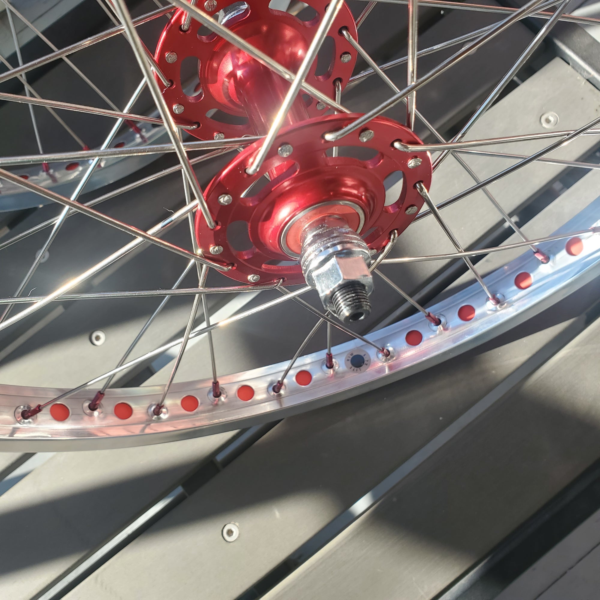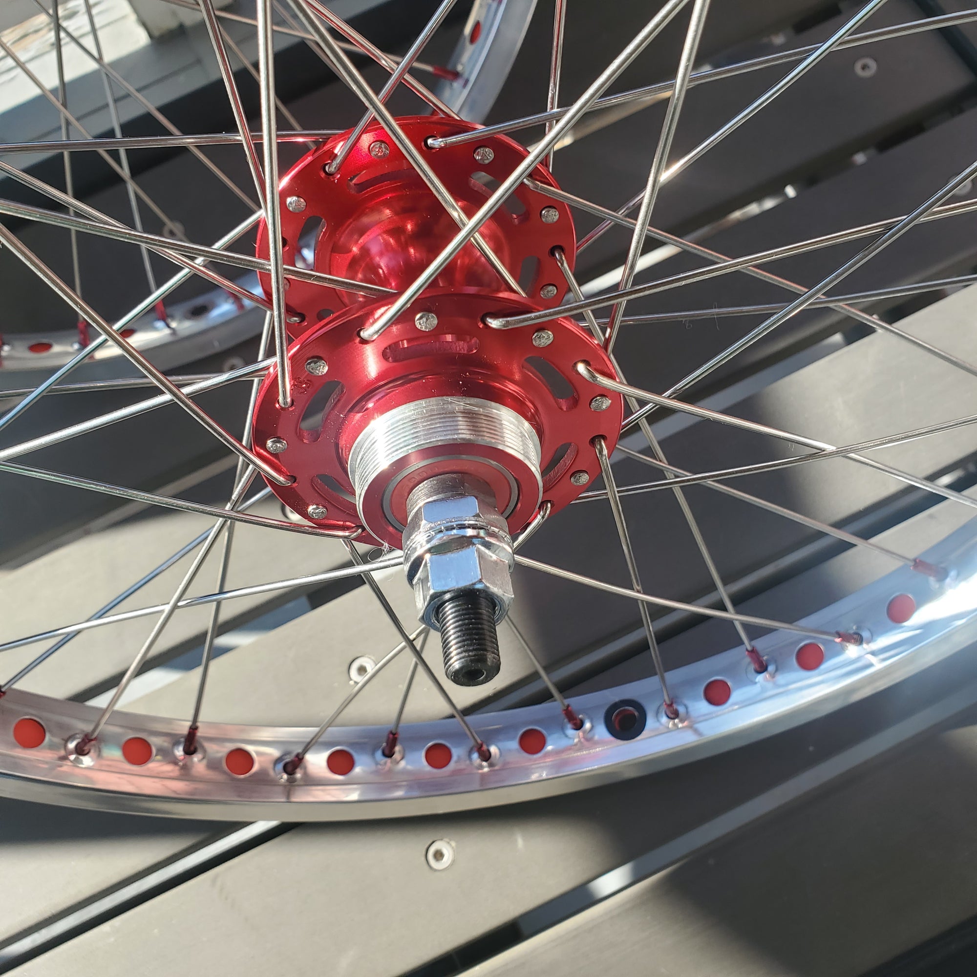 The 36 spokes are stainless steel w/ 5/8" Red anodized aluminum nipples, and they are built 3X. These wheels will accept 20 x 1.75 - 2.40 tires (406mm).