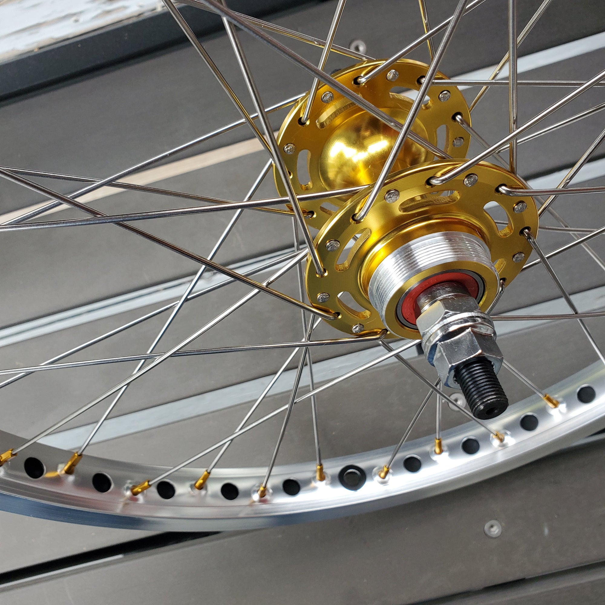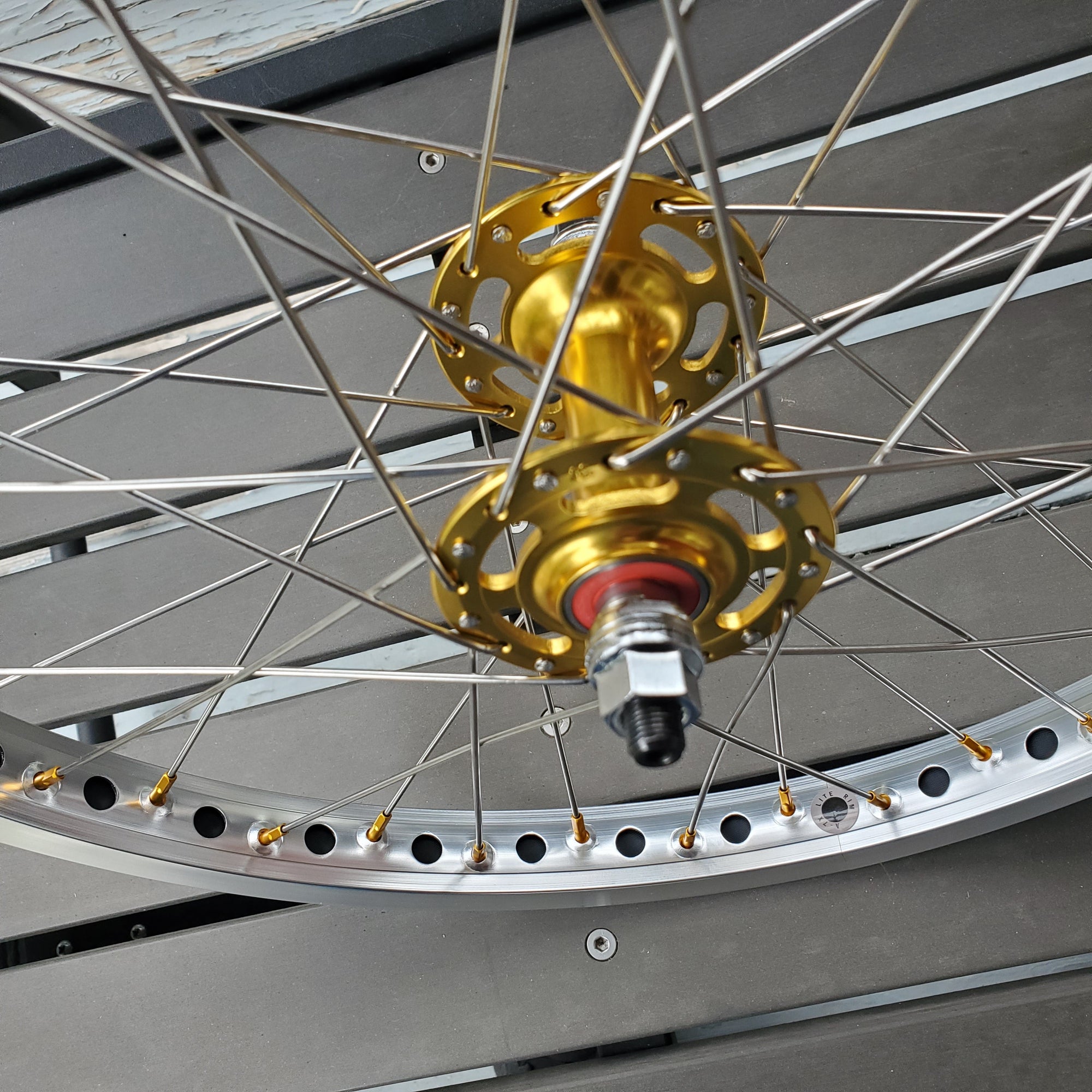 The 36 spokes are stainless steel w/ 5/8" Gold anodized aluminum nipples, and they are built 3X. These wheels will accept 20 x 1.75 - 2.40 tires (406mm).
