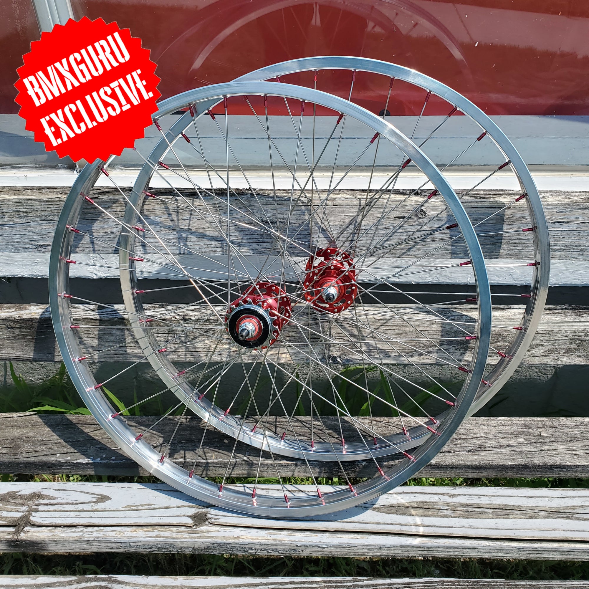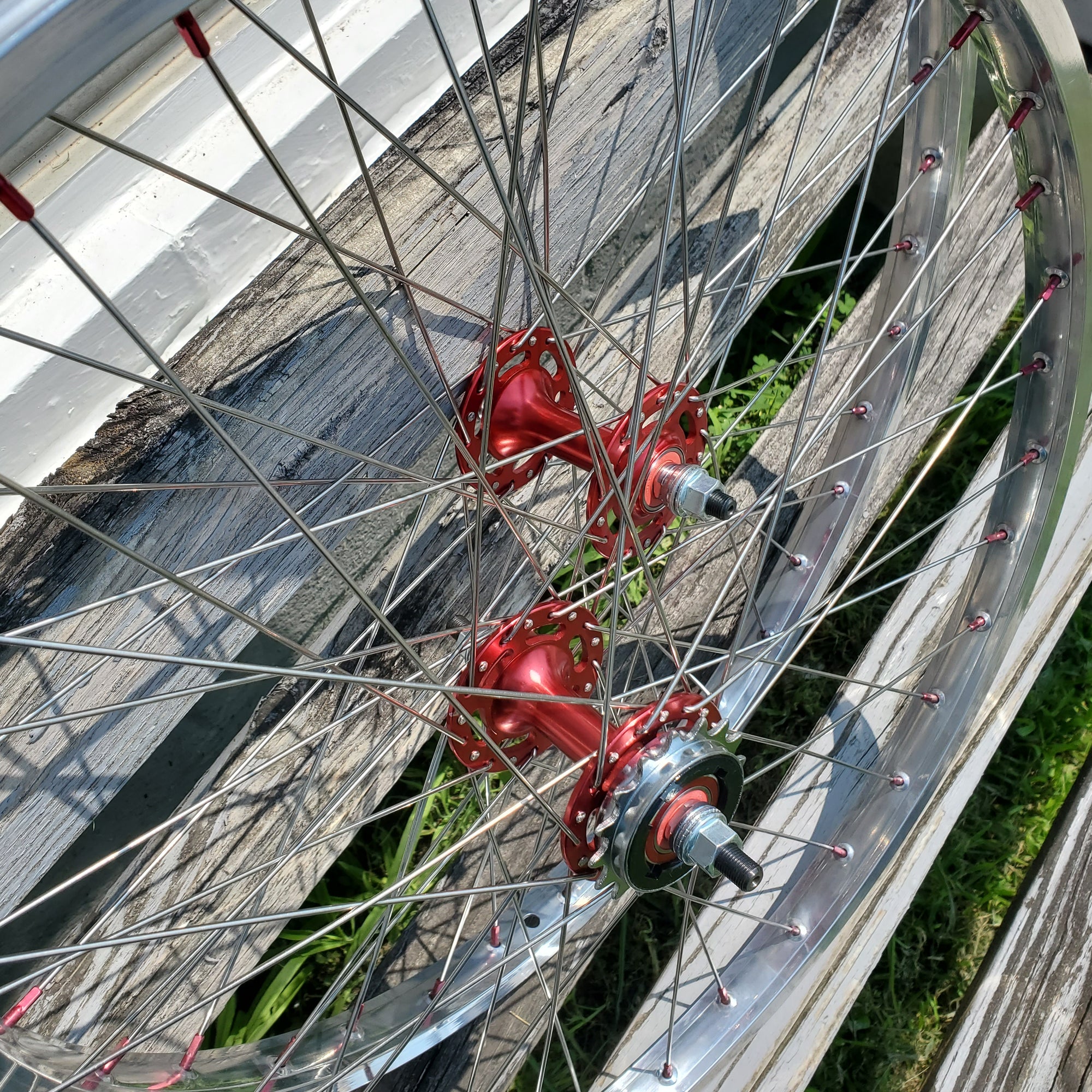 26" 7X style Sealed Road Flange BMX Wheelset w/ 16t Freewheel - Pair - Polished / Red