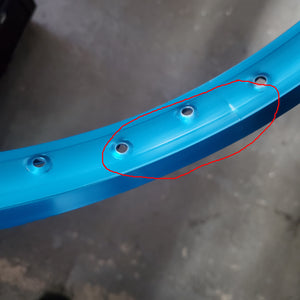 This rim has a cosmetic blemish in the finish. On pinned rims it is normal to have slight finish blem at the seem but this rim has a large "wear" spot in the anodized finish as you can see in the 2nd photo. This item is sold as-is, no returns so please ask all questions before you buy. This would be perfect for a rider or even for someone that is re-finishing with a custom color.