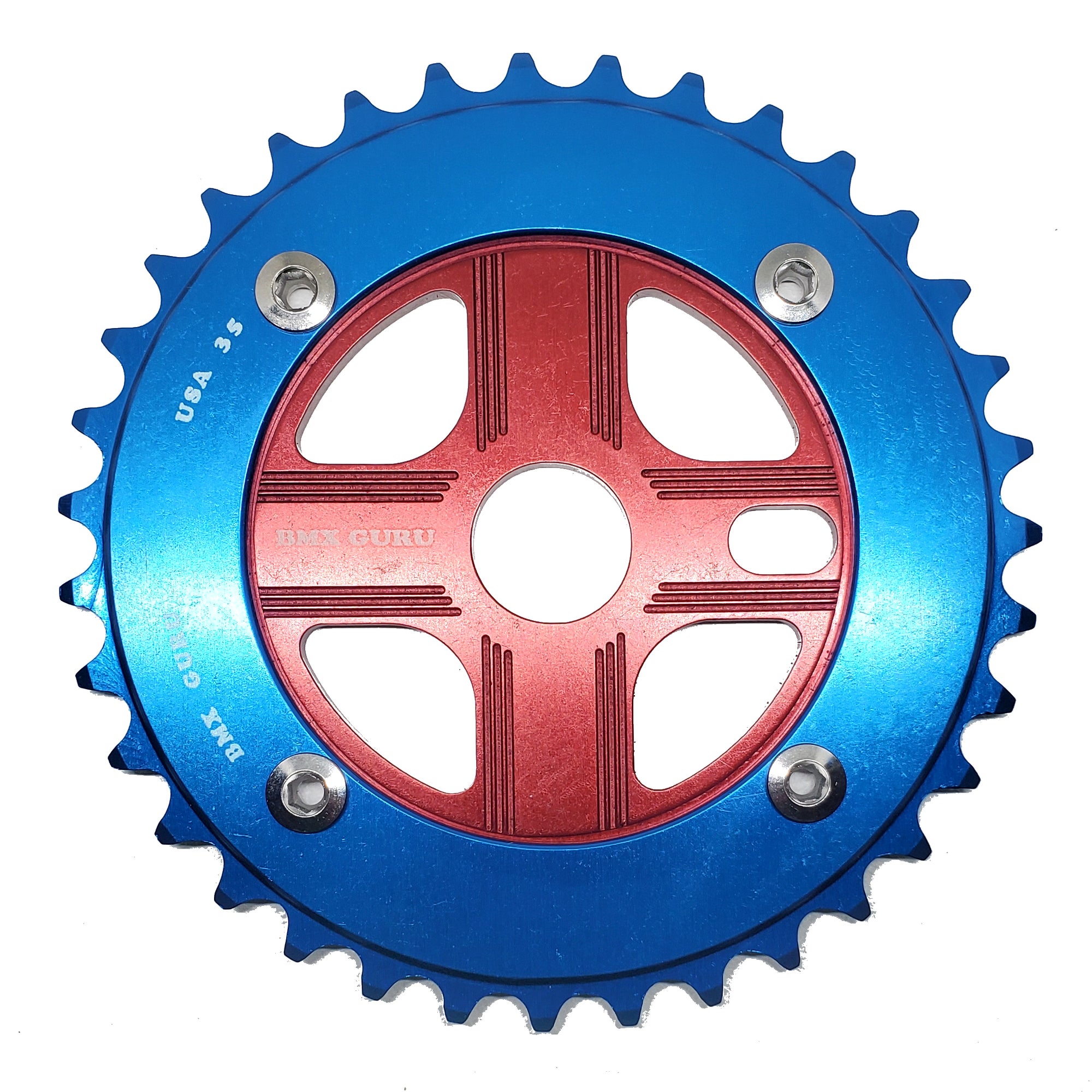 BMXGuru 35T Aluminum Spider & 4-bolt Chainring Combo - Blue over Red - USA Made