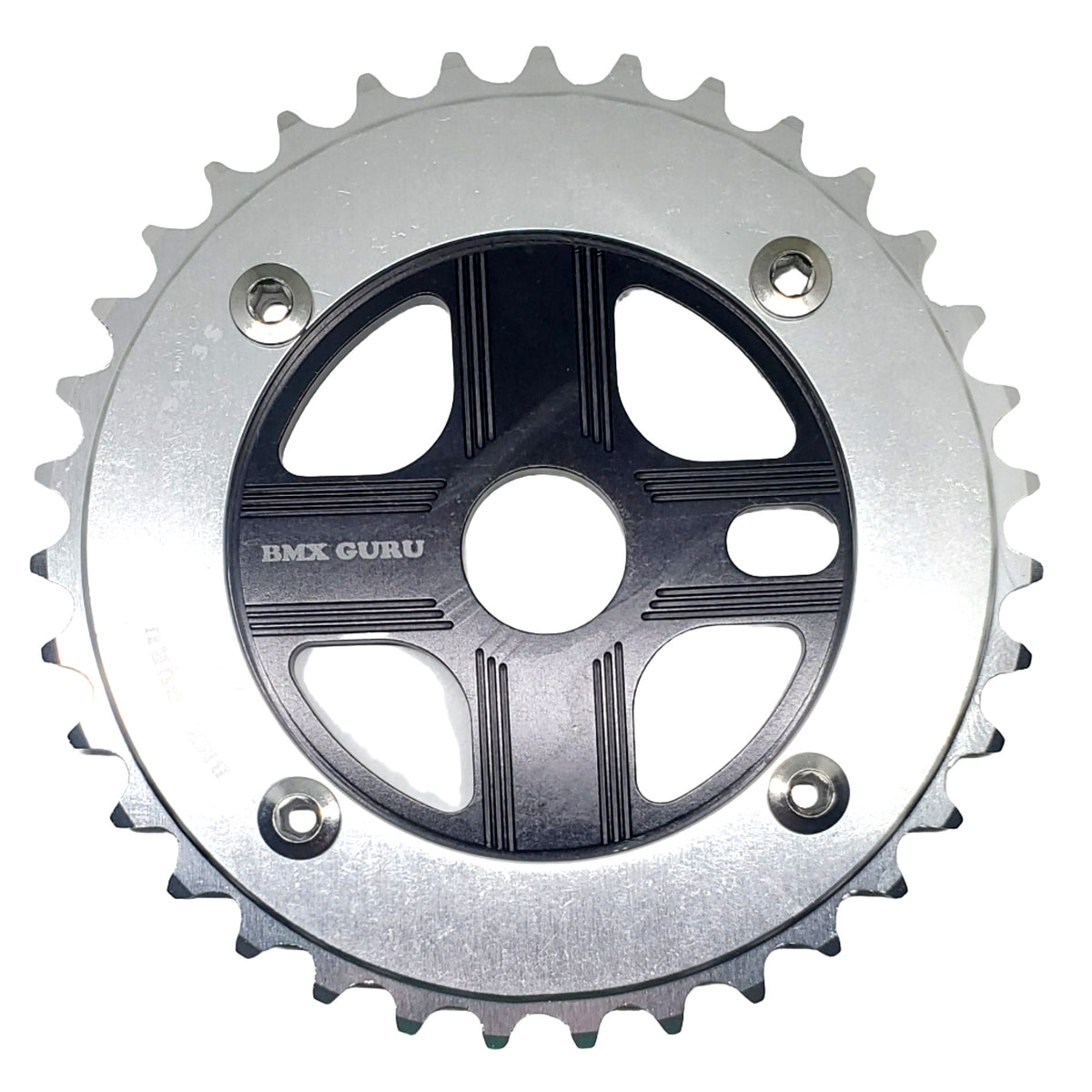 BMXGuru 35T Aluminum Spider & 4-bolt Chainring Combo - Silver over Black - USA Made