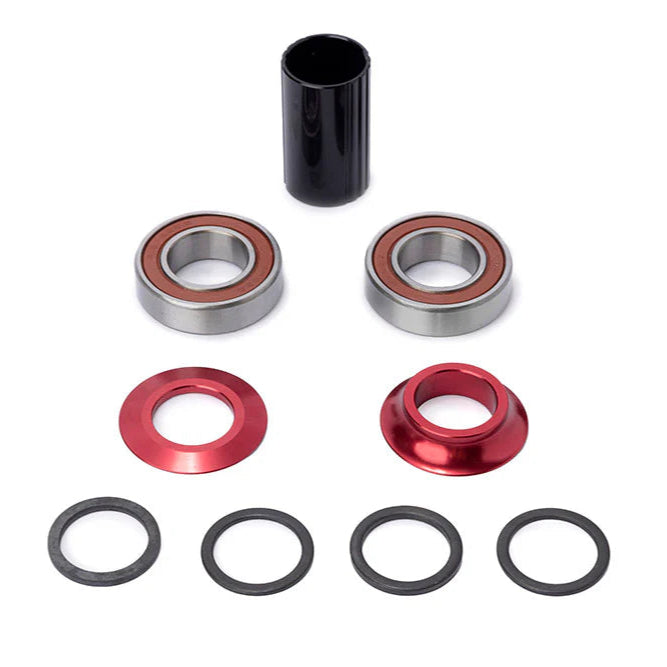 The Theory 22mm Mid BMX Bottom Bracket Kit includes , sealed bearings, anodized cone spacers, bottom bracket spacers, and a tube spacer.