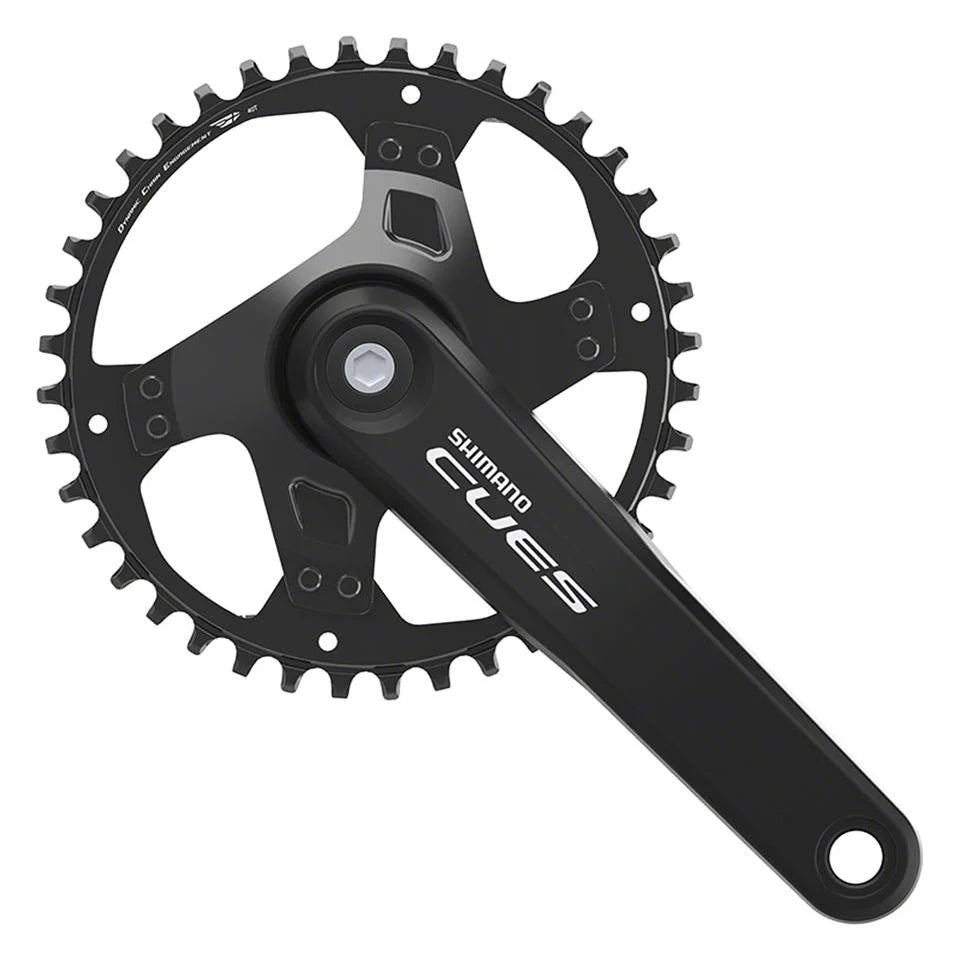 Grow your confidence riding hard over the rough stuff with this Shimano CUES FC-U4000-1 crankset's wide-range gearing and seamless pedaling. Works with Cues 9, 10 and 11 speed systems.