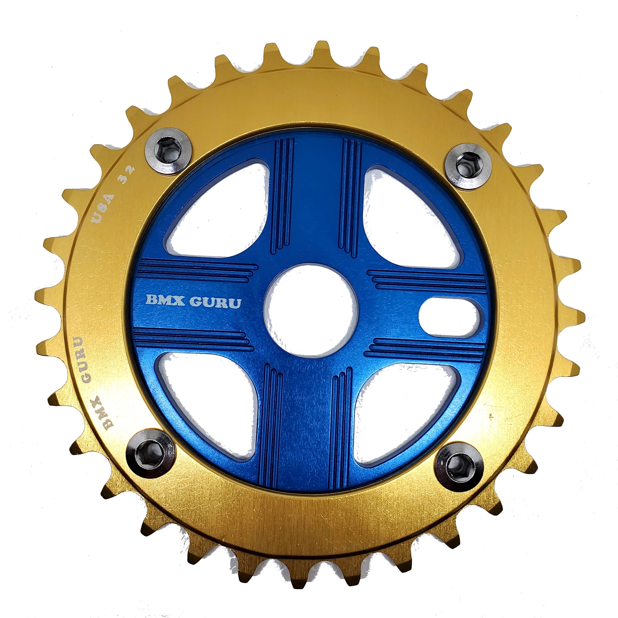 BMXGuru 32T Aluminum Spider & 4-bolt Chainring Combo - Gold over Blue - USA Made