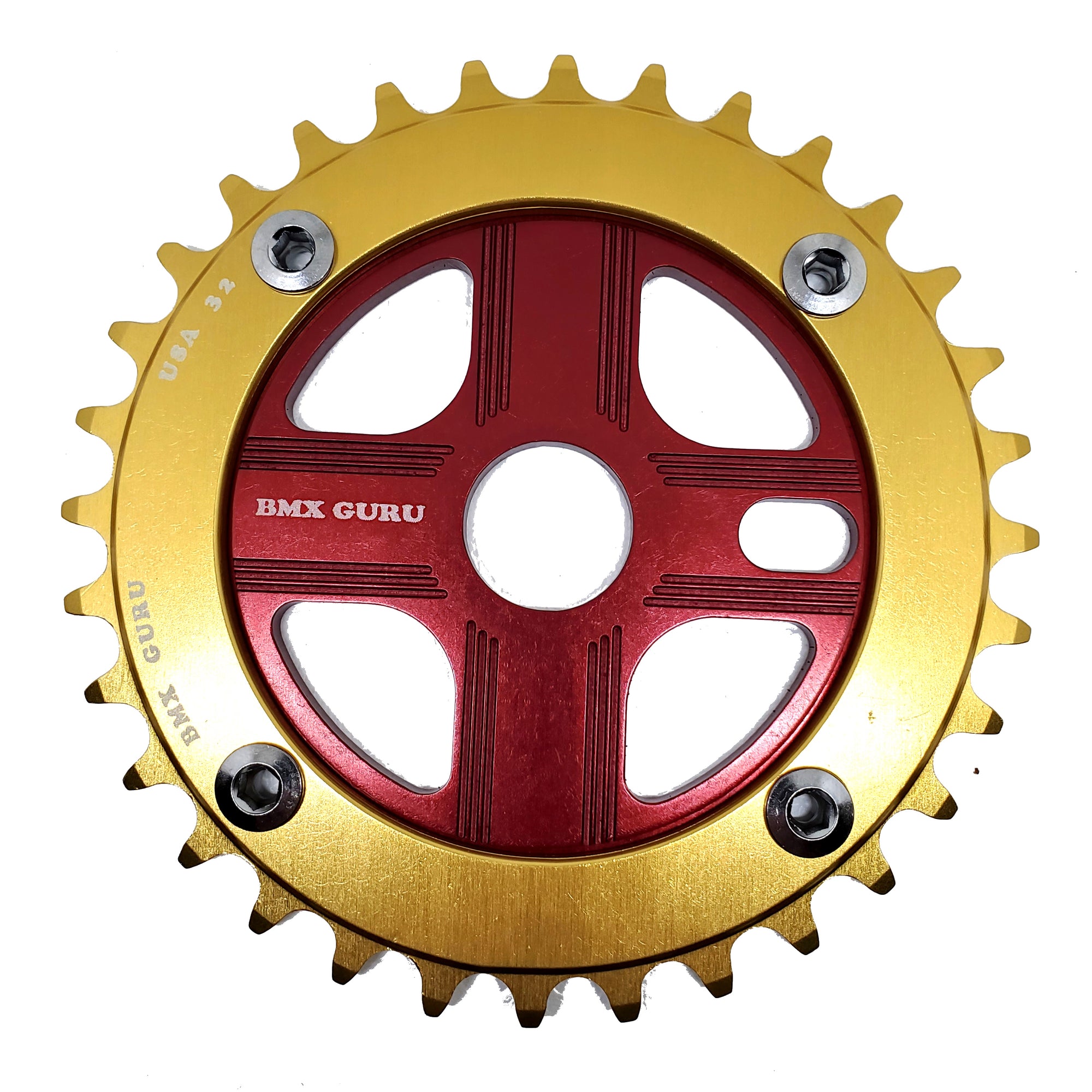 BMXGuru 32T Aluminum Spider & 4-bolt Chainring Combo - Gold over Red - USA Made