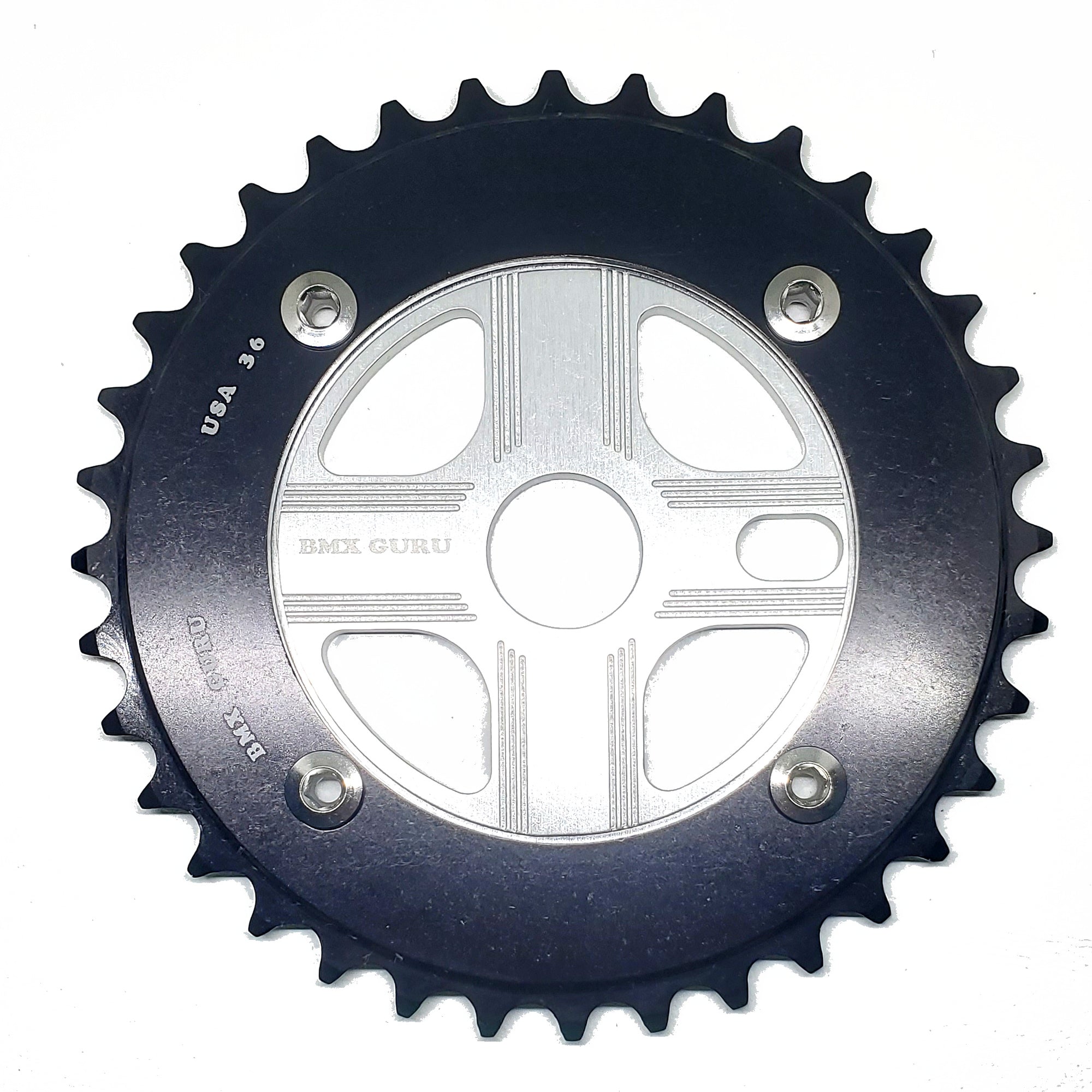 BMXGuru 36T Aluminum Spider & 4-bolt Chainring Combo - Black over Silver - USA Made