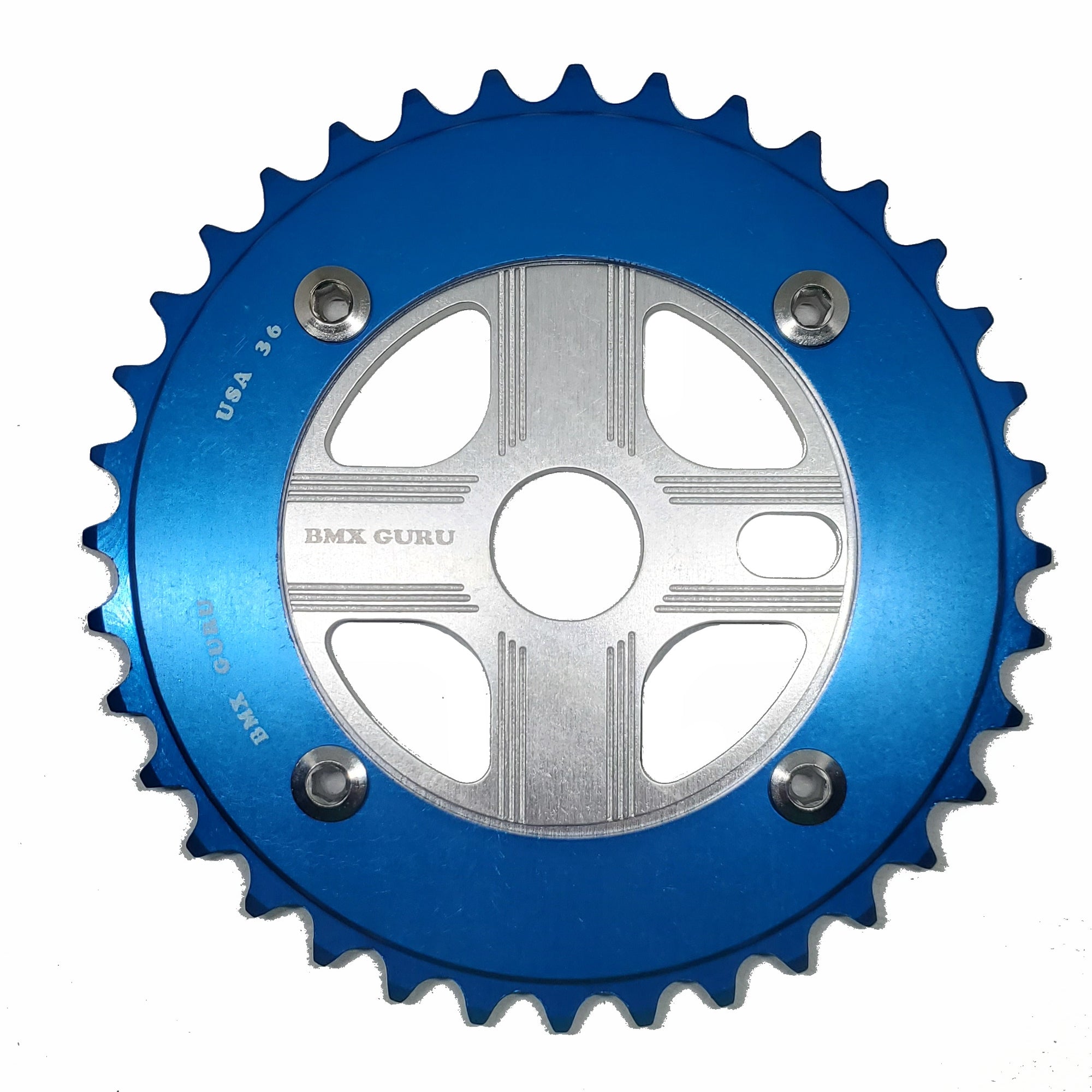 BMXGuru 36T Aluminum Spider & 4-bolt Chainring Combo - Blue over Silver - USA Made