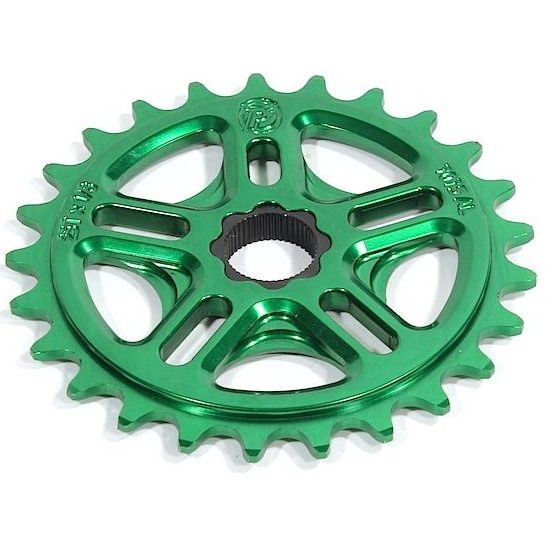 The Profile Spline drive sprocket is CNC machined from 7075 Aluminum in the USA. This sprocket does not require a sprocket bolt; instead, it has a hardened CrMo steel insert that matches up to the 48 splines on the crank axle for pure, direct power transfer. This has 1/8″ tooth width for use with most freestyle/street & single speed chains. It will only work with 19mm, 48-spline 3-piece cranks.