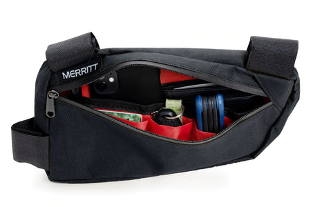 The Merritt Corner Pocket Xl is a larger bag -- perfect for bigger bikes. It features a large main pocket and slim inner pocket with individual sleeves to keep smaller items organized. The bag is constructed of 1000D Cordura nylon exterior with a water resistant zipper and Velcro straps. Items pictured inside bag not included.