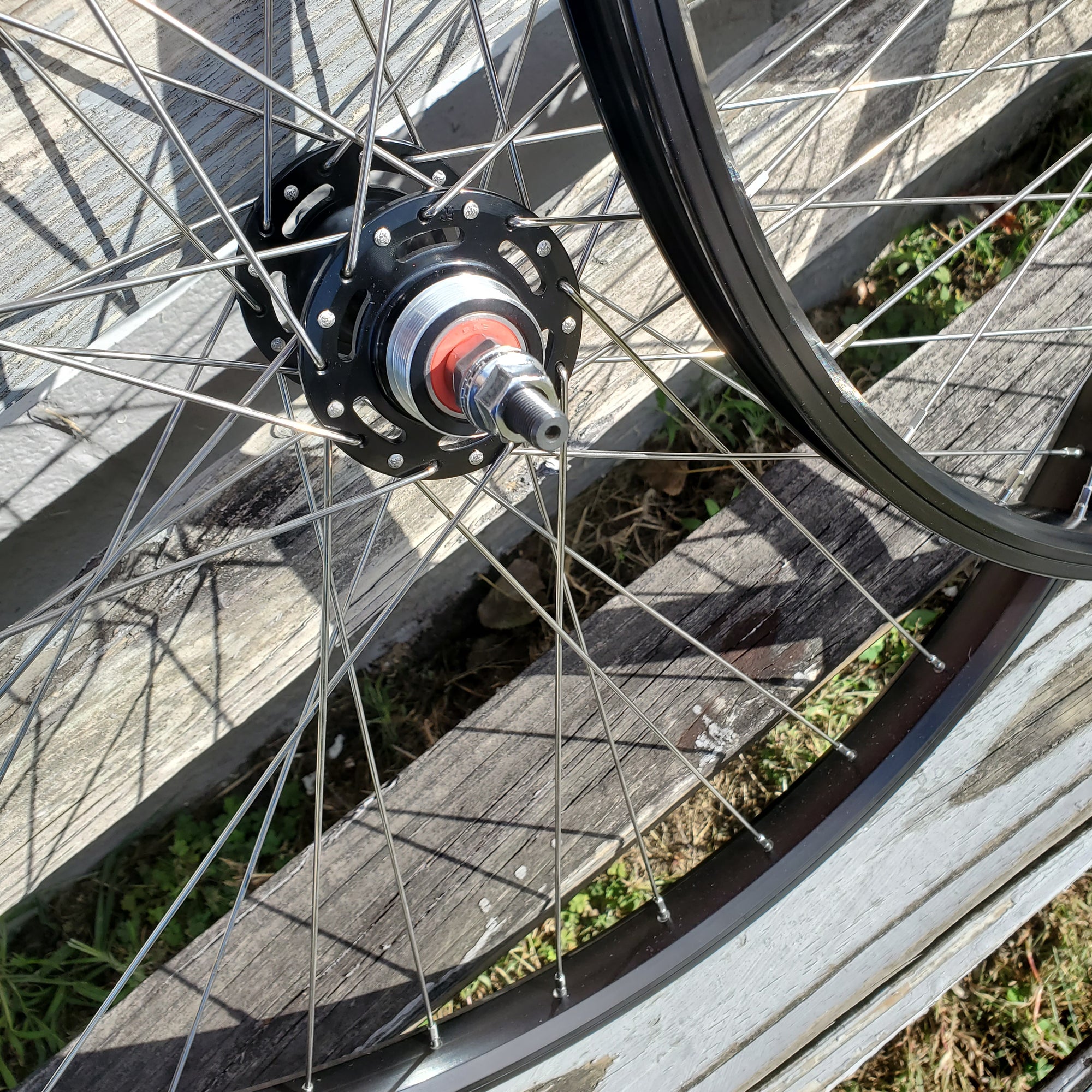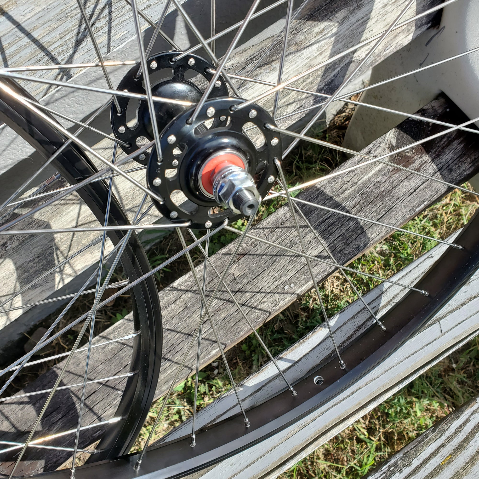 This 29" Double wall wheelset (front & rear) features SE black J24SG double wall aluminum rims w/ pinned seams and brake wear indicators. It is built with black 36-hole high-flange hubs with cutouts. Both hubs have 3/8" axles; the rear hub is freewheel for use with a 16T or larger freewheel (not included). Silver stainless steel spokes with 16mm silver brass nipples complete the build.