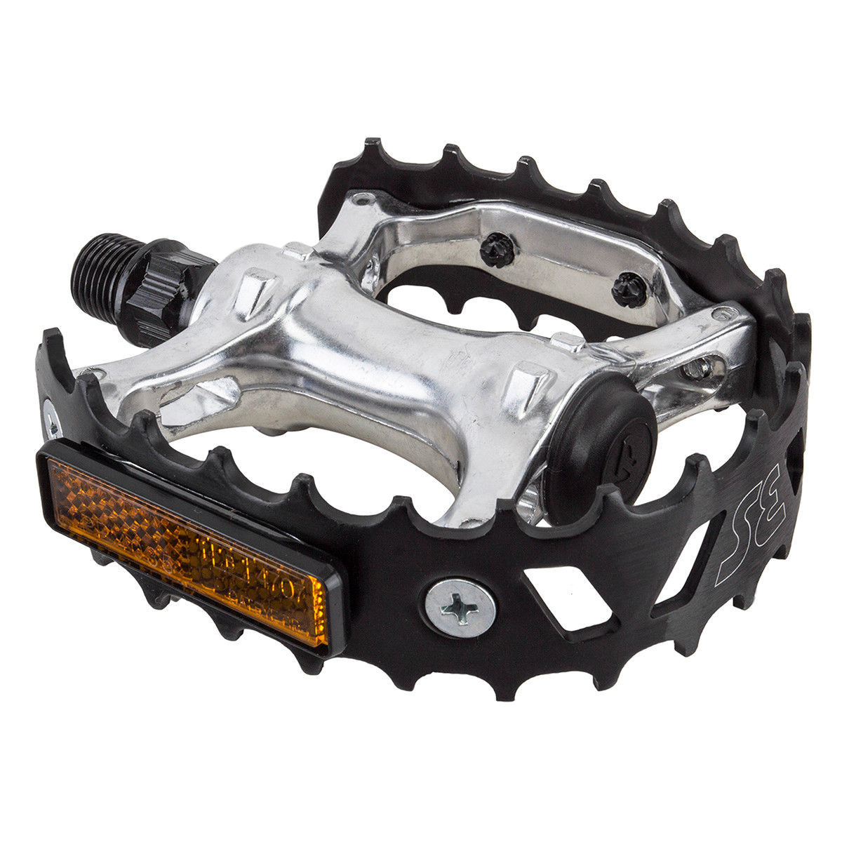 These pedals have an alloy body, anodized alloy cage, chromoly spindle, and loose bearings. They have a 9/16" chromoly axle to fit three-piece cranks.