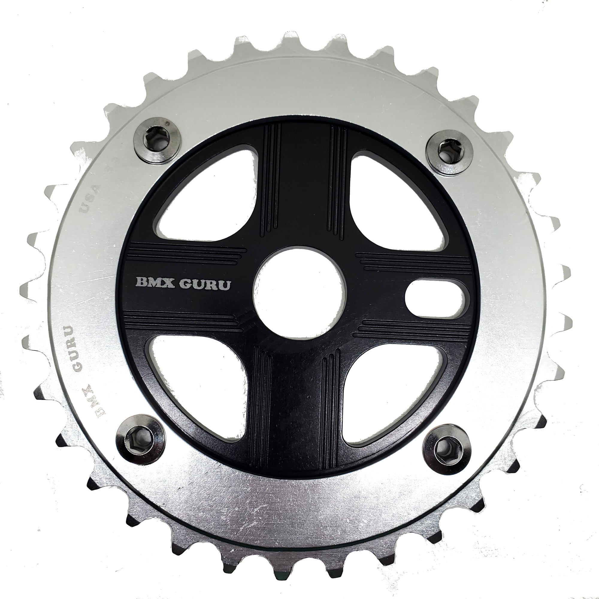 BMXGuru 33T Aluminum Spider & 4-bolt Chainring Combo - Silver over Black - USA Made