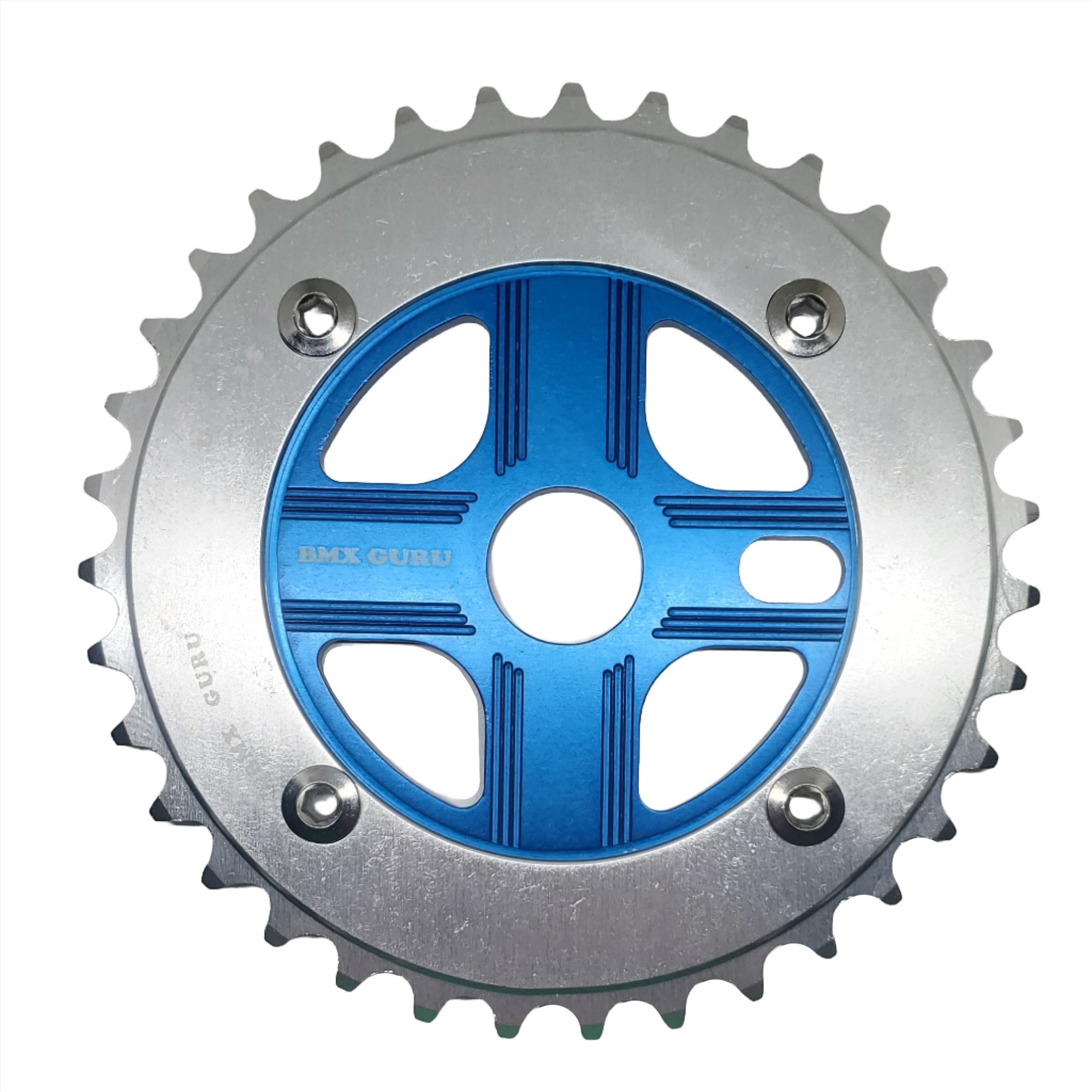 BMXGuru 35T Aluminum Spider & 4-bolt Chainring Combo - Silver over Blue - USA Made