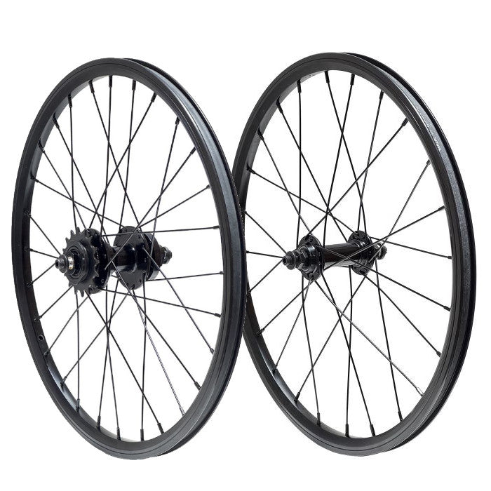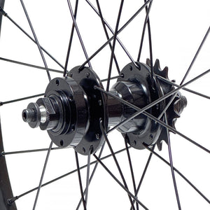 This is a 18 x 1 (400mm) wheelset (one front and one rear) featuring black anodized double wall rims. The hubs are black sealed cartridge with 3/8 female axles front & rear with M6 bolts; the rear hub is a Cassette which will work Shimano type cogs (16t included) and will work with 6B disc rotors. The spokes are black stainless spokes with black brass nipples. The front is a 24 spoke and rear is a 28 spoke wheel. These will accept x 18x1 and 1-3/8 tires (400mm). These will NOT fit standard 18" (355mm) tires. Rubber rim strips ARE included!
