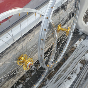 This is a 26" wheelset (one front and one rear). The rims are A-7X single wall and are polished aluminum in color. The hubs are gold anodized alloy high flange sealed bearing with Jelly Bean cut-outs on the flanges and 3/8 axles front & rear. They work with most any 16t or larger freewheel (not included). The 36 spokes are stainless steel w/ 5/8" gold anodized aluminum nipples. These will accept 26x1.75-2.40 tires (559mm)