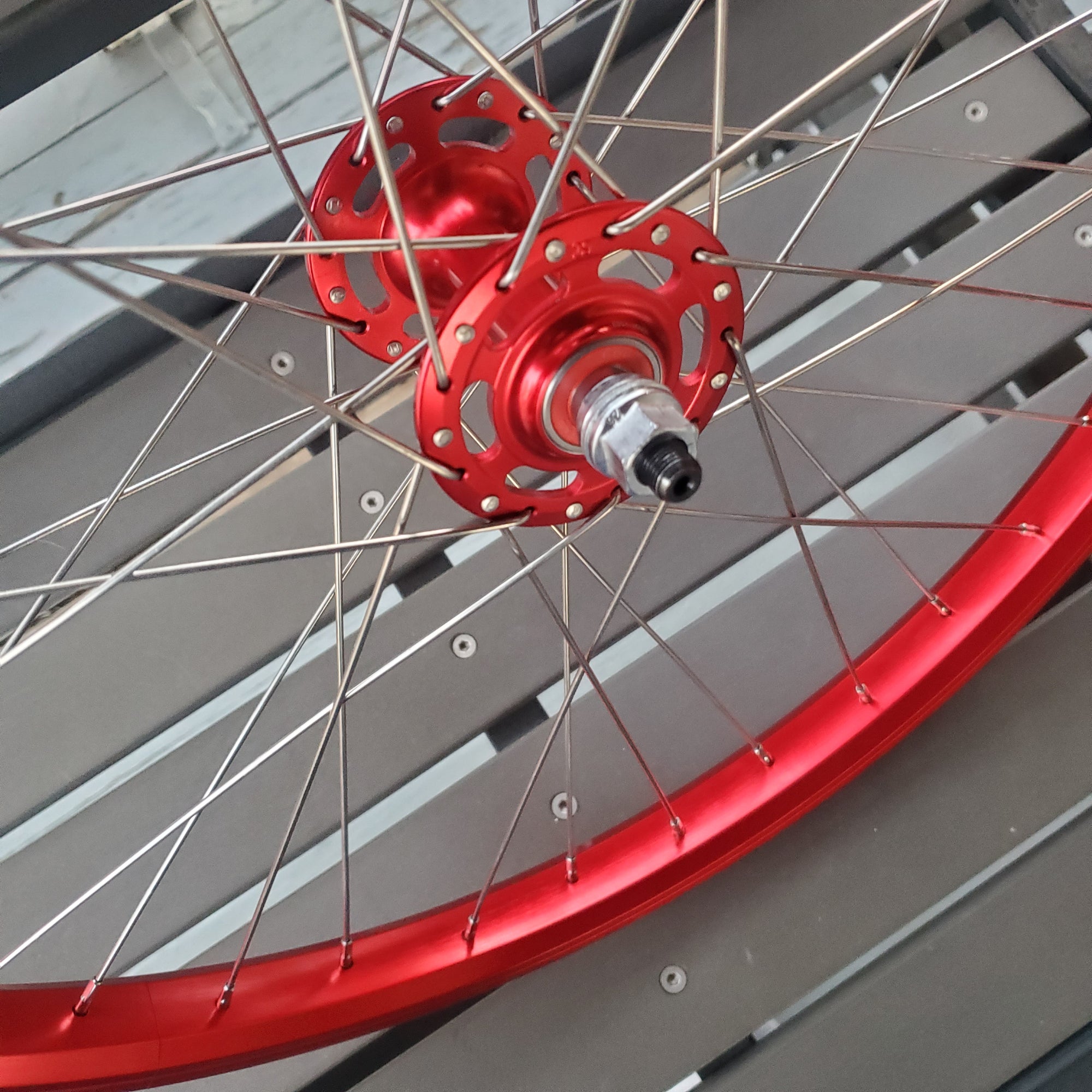 This 26" Double wall wheelset (front & rear) features SE anodized red J24SG double wall aluminum rims w/ pinned seams and brake wear indicators. It is built with red 36-hole high-flange hubs with cutouts. Both hubs have 3/8" axles; the rear hub is freewheel for use with a 16T or larger freewheel (not included). Silver stainless steel spokes with 16mm silver brass nipples complete the build.