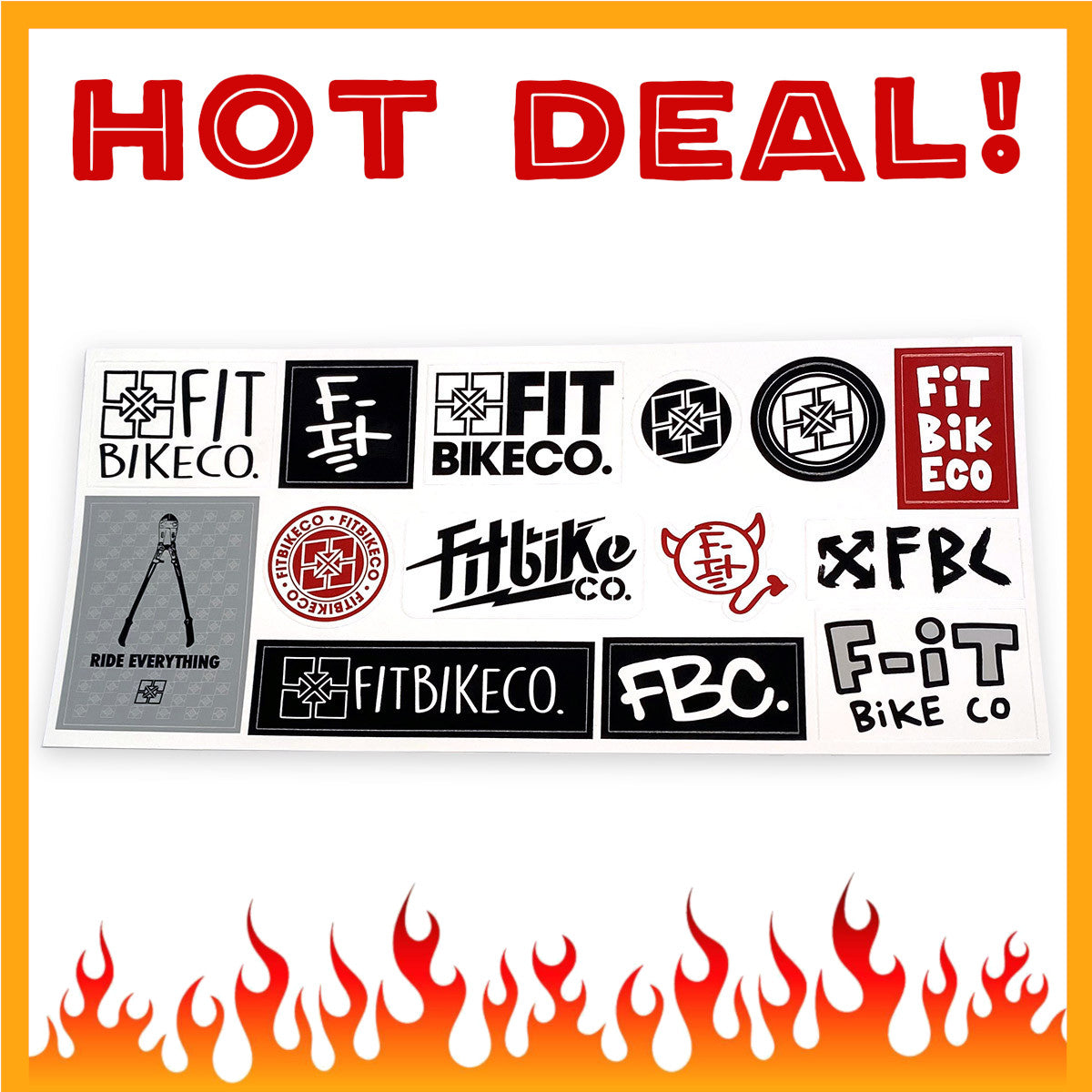 This Fit Bike Co Promo Sticker Sheet is a 9" x 4" sheet of 14 stickers thermal printed on white vinyl. Each sticker is kiss cut to size.